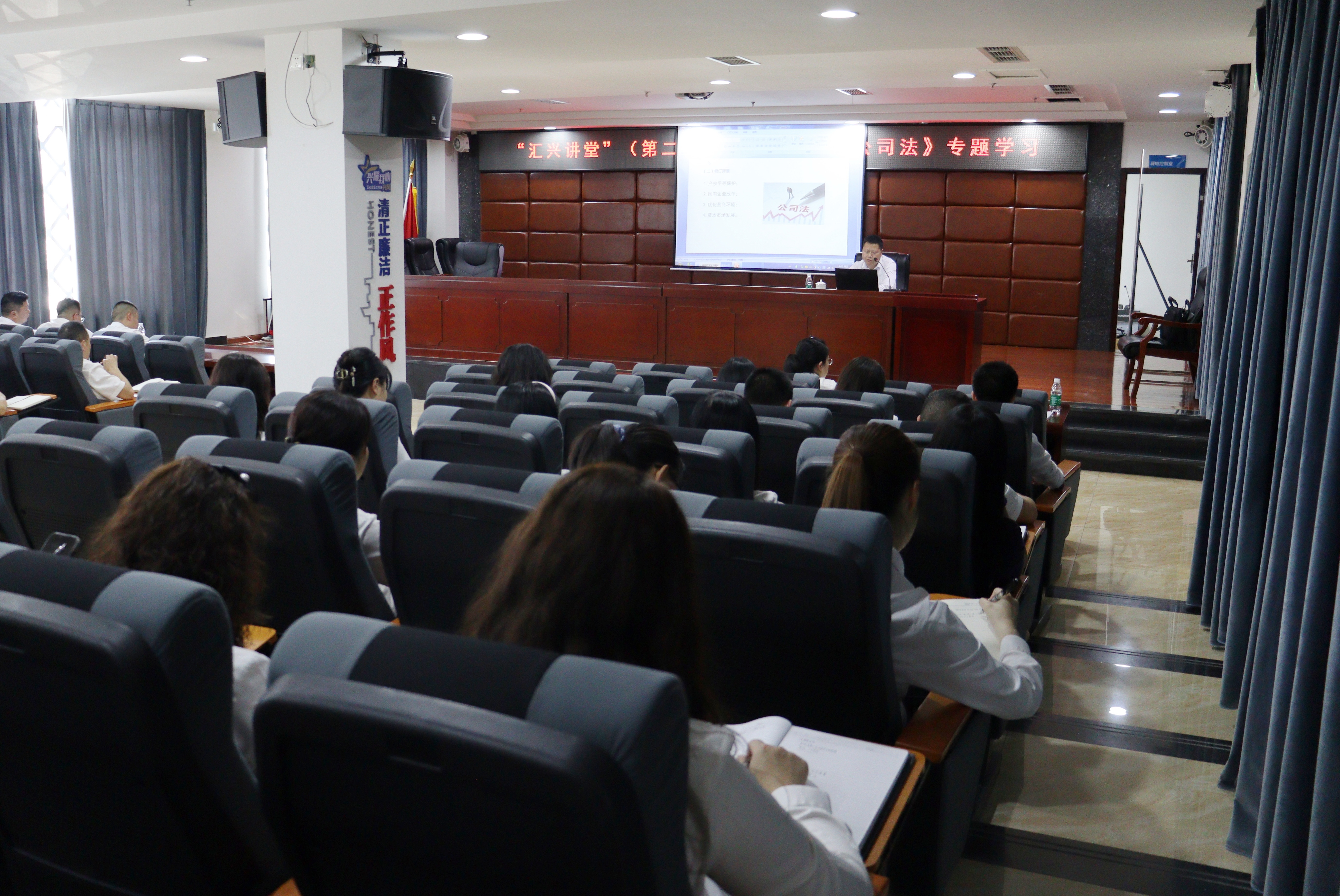為深入推進(jìn)依法治企,4月26日,集團(tuán)公司在二樓會議室舉辦“匯興講堂”第二期培訓(xùn)班。此次培訓(xùn)以“新《公司法》專題培訓(xùn)”為主題,由集團(tuán)公司法務(wù)部、紀(jì)檢監(jiān)察審計(jì)部部長王華主講,總公司及各子公司70余人參加。